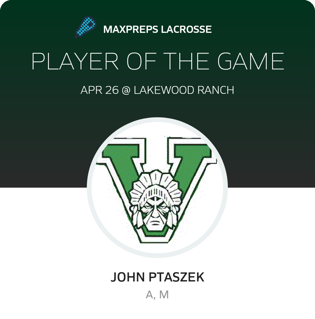Congratulations to #2 John Ptaszek for being selected the Venice Lacrosse Player of the Game.