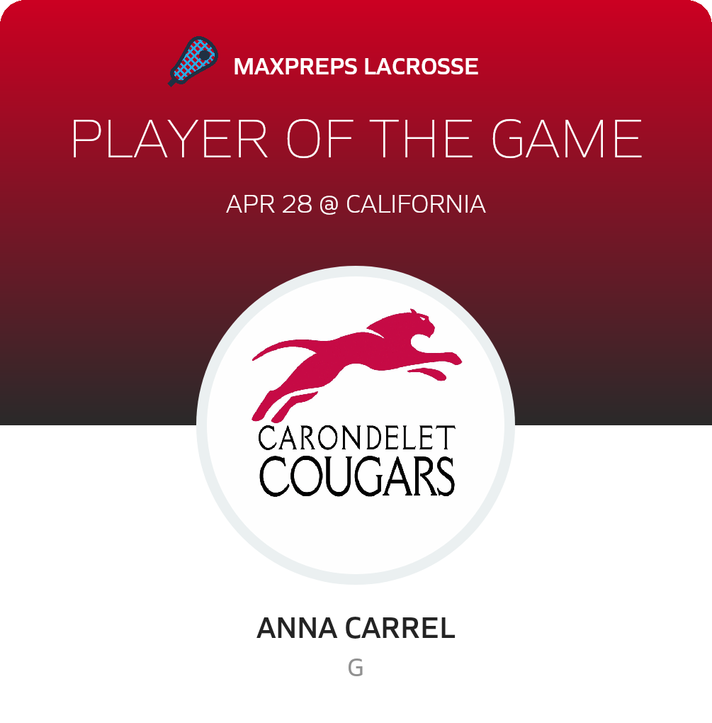 Congratulations to #28 Anna Carrel for being selected the Carondelet Girls Lacrosse Player of the Game.