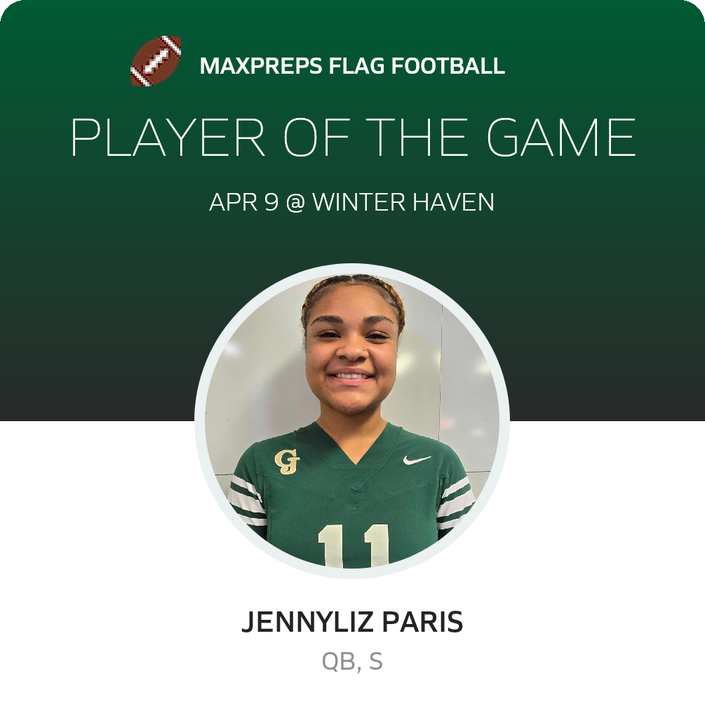 Congratulations to #11 Jennyliz Paris for being selected the George Jenkins Girls Flag Football Player of the Game.