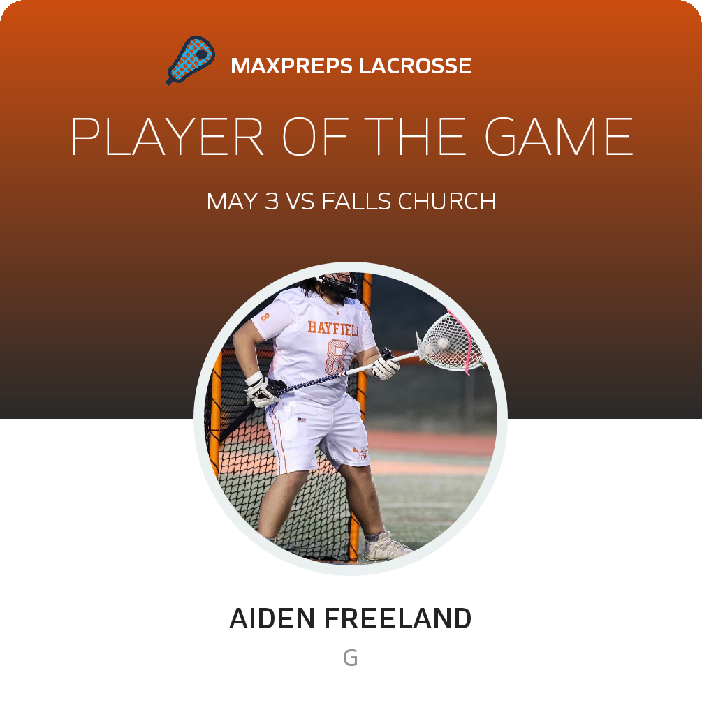 Congratulations to #8 Aiden Freeland for being selected the Hayfield Lacrosse Player of the Game.
