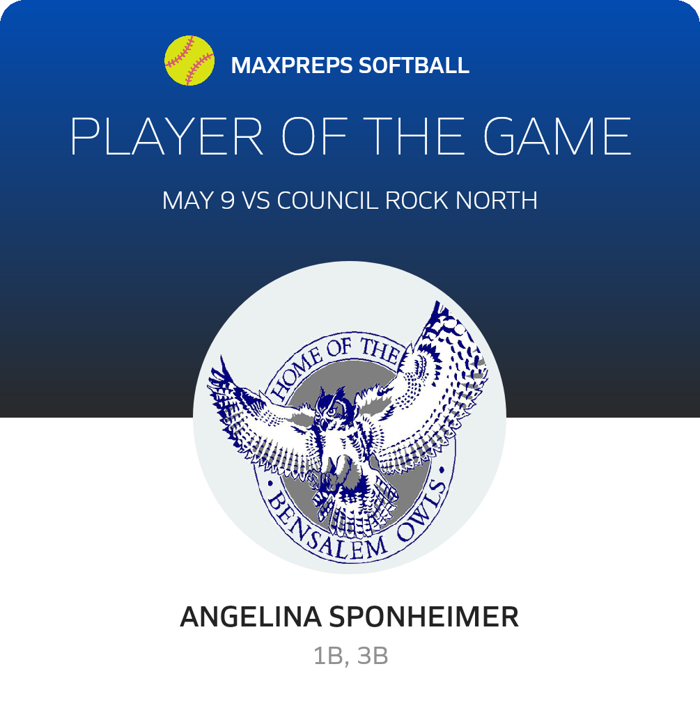 Congratulations to #17 Angelina Sponheimer for being selected the Bensalem Softball Player of the Game.