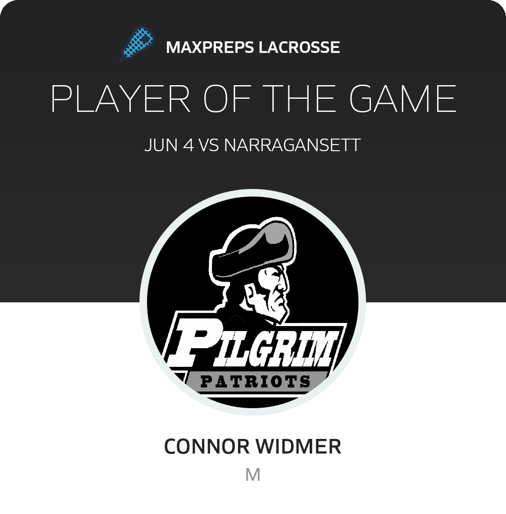 Congratulations to #1 Connor Widmer for being selected the Pilgrim JV Lacrosse Player of the Game.