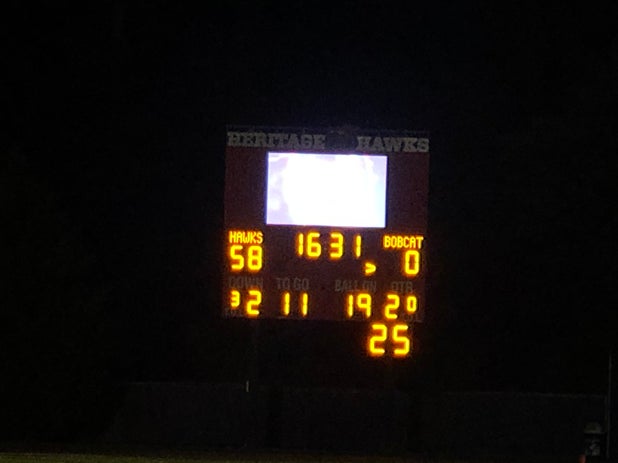 In Friday's non-league game, the Heritage Hawks (Newnan, GA) football team smashed the visiting St. Mary's Bobcats (Fairburn, GA), by a score of 72-0.