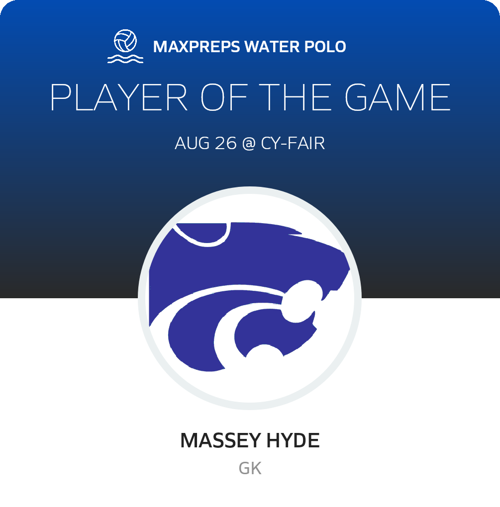 Congratulations to #1 Massey Hyde for being selected the Cypress Creek Water Polo Player of the Game.