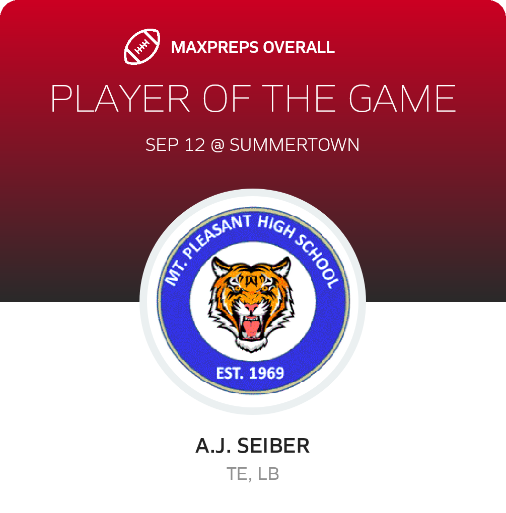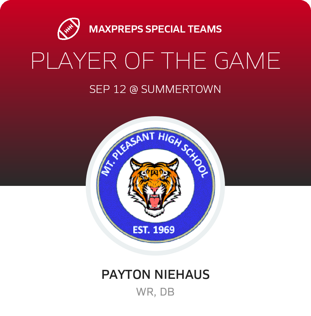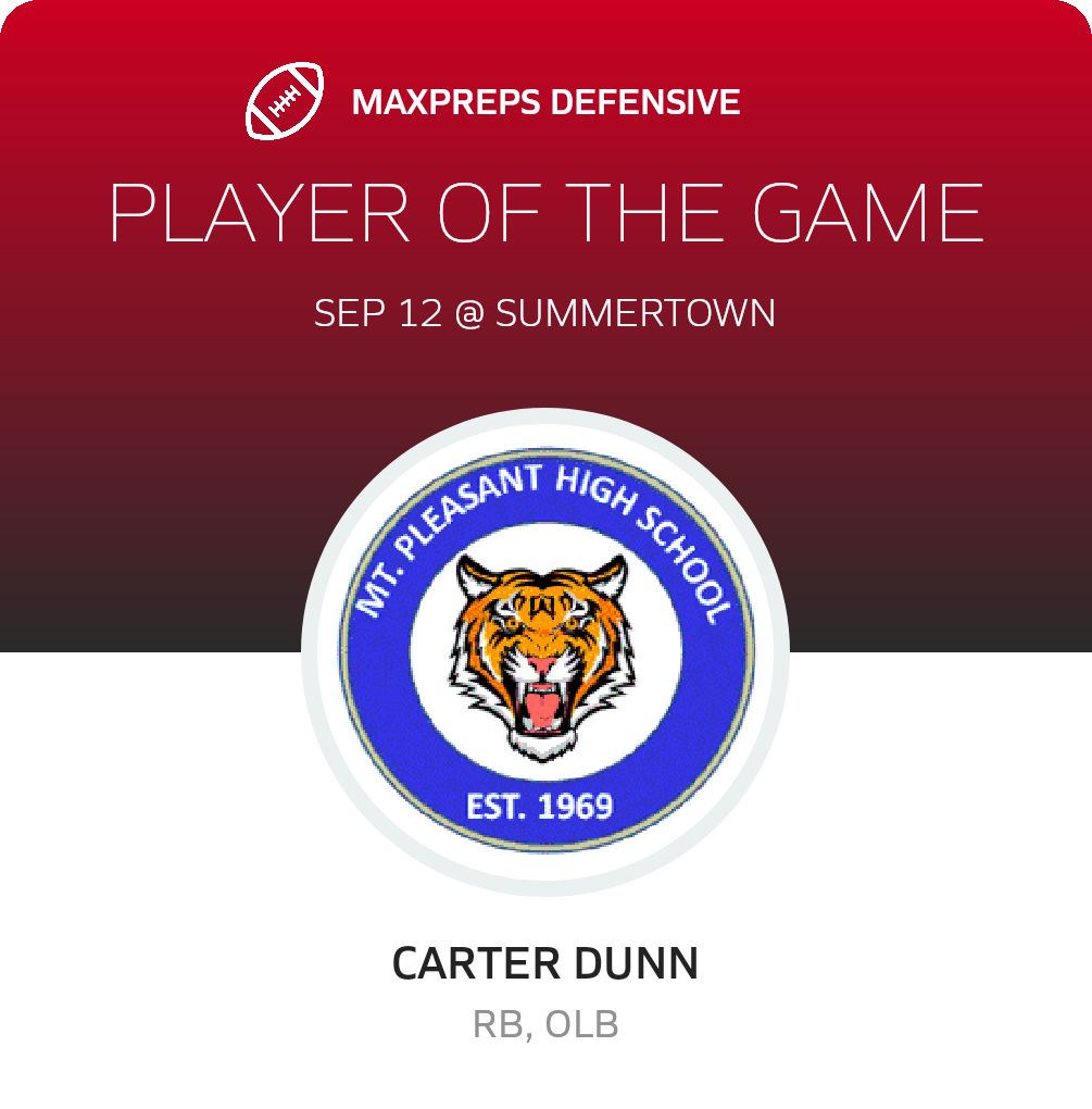 In their next game, the Tigers play the Riverside Panthers (Decaturville, TN) in a 2A Region 5 challenge, on Friday, September 19. Mt. Pleasant will attempt to improve on its 3-1 season record. The Panthers go into the challenge with a 0-4 record after their 46-6 league loss to Adamsville (Adamsville, TN).
