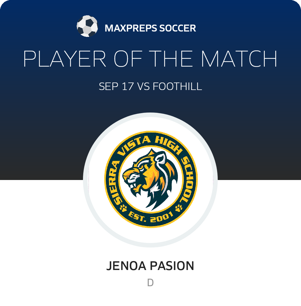 Congratulations to #9 Jenoa Pasion for being selected the Sierra Vista Girls Soccer Player of the Match.