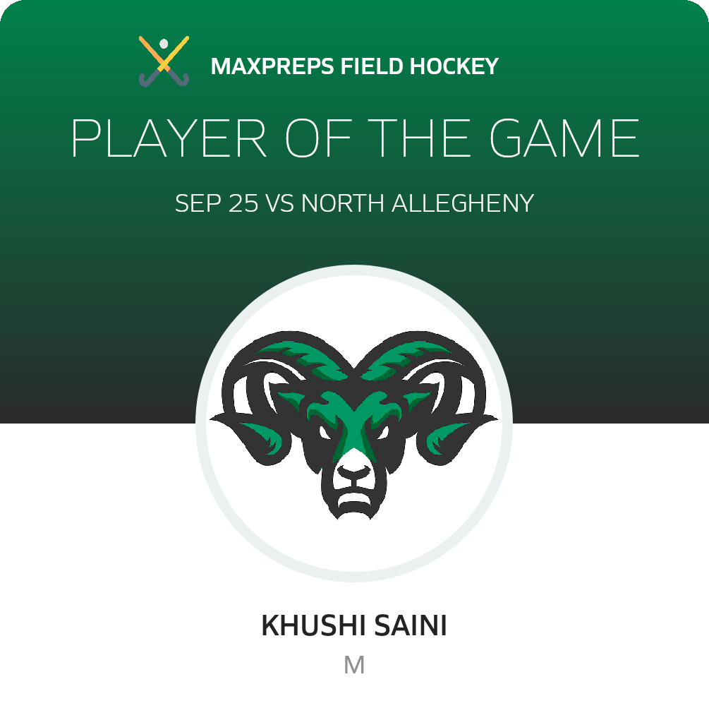 Congratulations to #27 Khushi Saini for being selected the Pine-Richland Field Hockey Player of the Game.