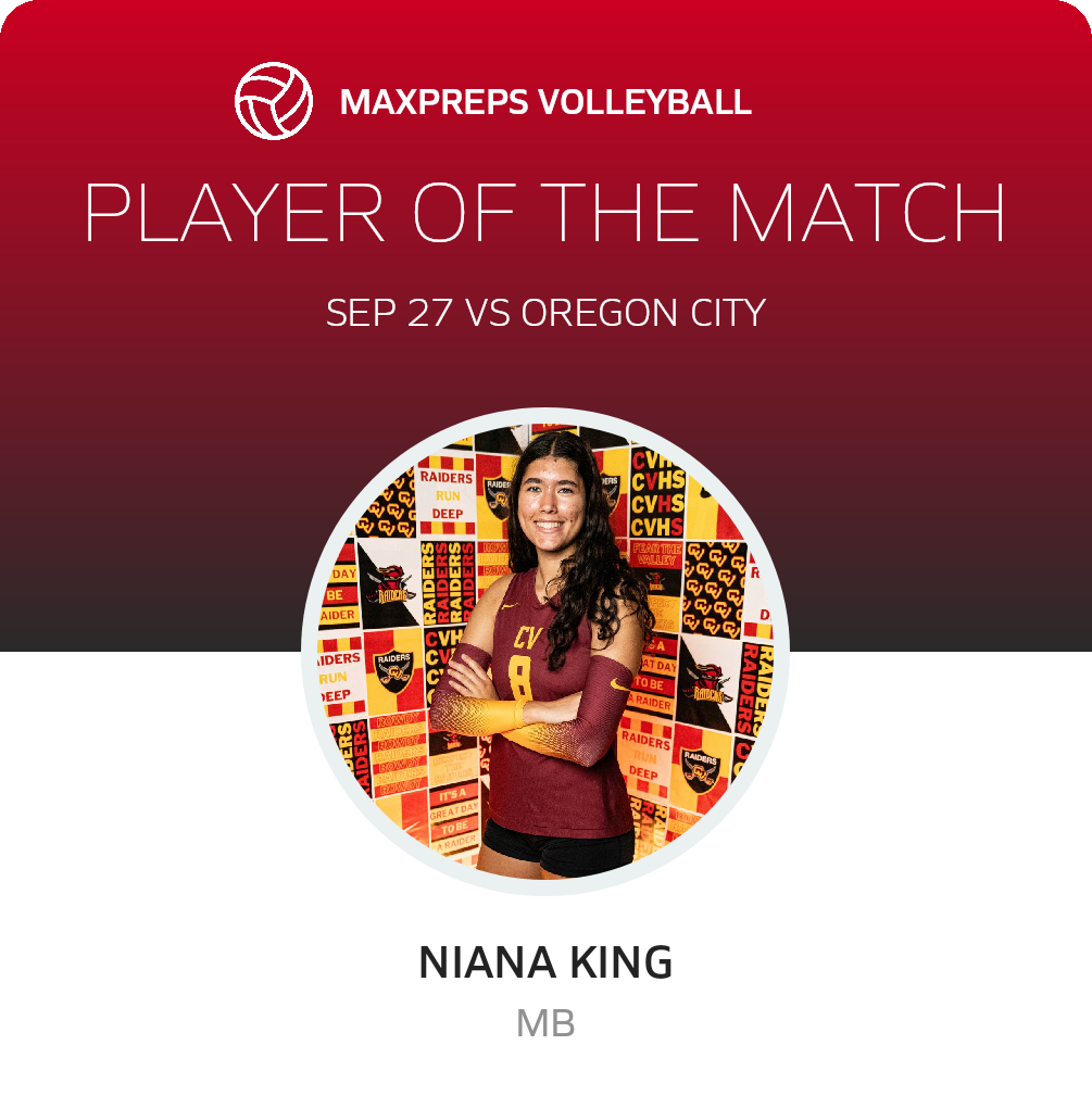 Congratulations to #8 Niana King for being selected the Crescent Valley Volleyball Player of the Match.