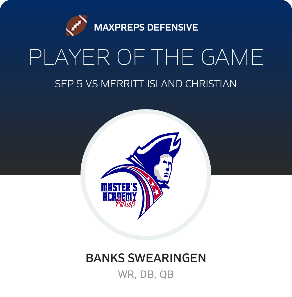 Coming up next, the Cougars confront the Master's Academy Patriots (Vero Beach, FL) in a match, on Thursday, October 3. Merritt Island Christian will attempt to upgrade on its 0-1 season record. The Patriots come into the match with a 3-0 record after their 52-18 league win over Merritt Island Christian (Merritt Island, FL).