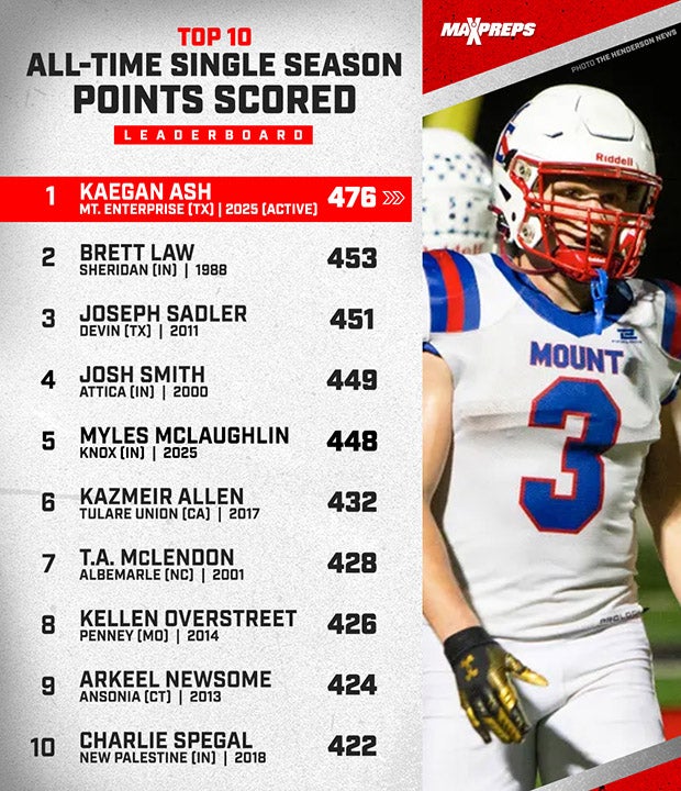 Committed to Texas Tech where he is expected to play linebacker, Ash has been one of the most prolific running backs in the country this season. His yardage total following Friday's win is 3,793, which is good for No. 2 nationally.
