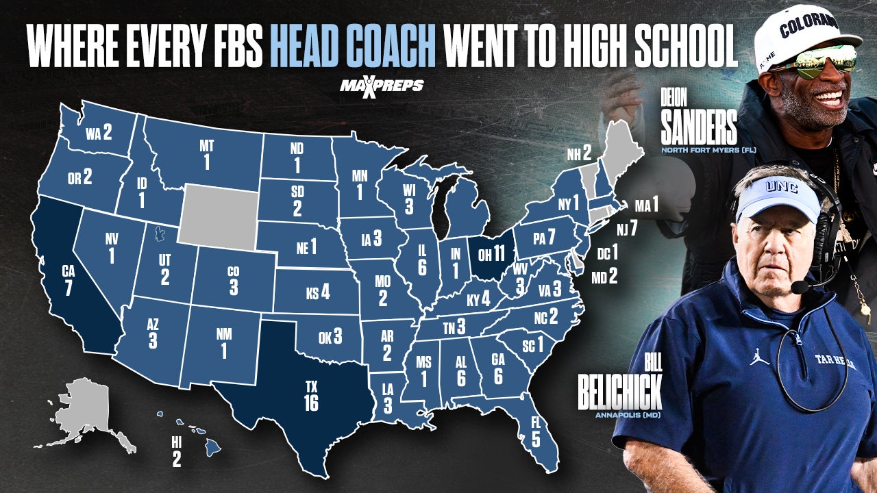 California, New Jersey and Pennsylvania rank third with seven current head coaches apiece.