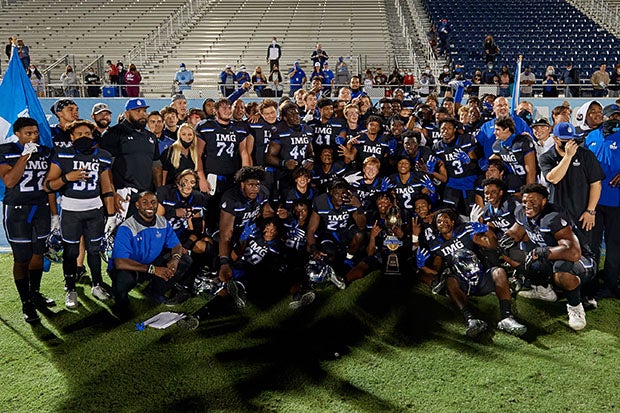 IMG Academy celebrates after capping an unbeaten 2020 season with a win over TRU Prep Academy.
