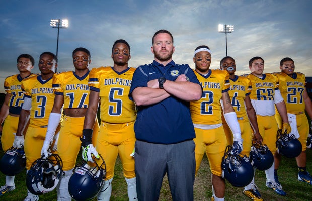 Ocean Lakes head coach Chris Scott poses along with eight of his top players during a photo shoot staged on campus in May.