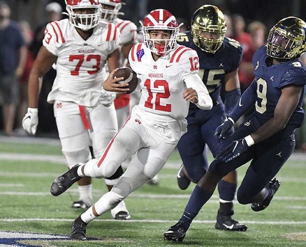 Following a dead even first half, the Monarchs (4-0, 1-0) scored three unanswered touchdowns after intermission to beat their Trinity League rivals in this annual high profile October meeting that has drawn national attention over the last five years. This one, with fans draped over rails clad in Mater Dei cardinal red and Bosco navy blue, didn't disappoint as it featured more than 800 yards of offense, hard-hitting defense, pinpoint passes, terrific receptions, determined runs and no turnovers.