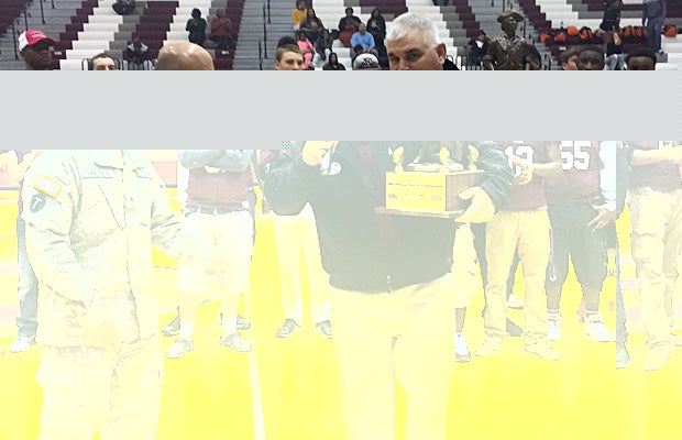 During halftime of an exciting home basketball game, Mark Warde, Editor of the Ennis Daily News, stepped to the podium and welcomed all of the fans to the celebration and thanked them for their support and enthusiasm. He then introduced Dustin Gaines from MaxPreps who spoke of Ennis' success in finishing with such a high ranking. Once the crowd finished cheering, Dustin introduced Staff Sergeant John Parades of the Texas Army National Guard. SSG Parades congratulated the team and charged up the crowd. SSG Parades then presented the Army National Guard national ranking trophy to Coach Alvarez in recognition for the team's amazing accomplishments.
